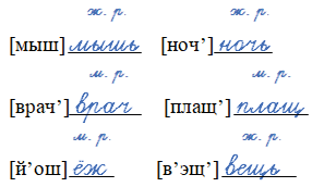 Произнесите слова. Замените звуковые обозначения слов буквенными. Укажите род имён существительных.