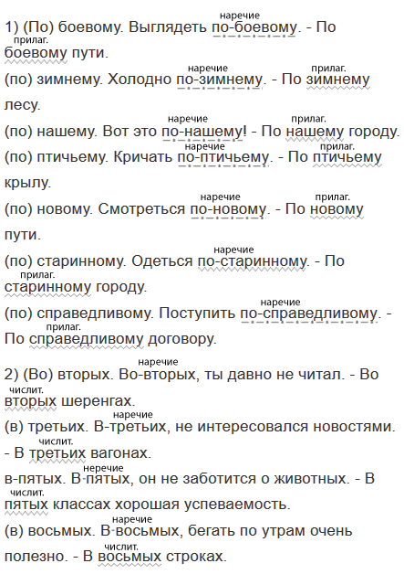 1) (По) боевому, (по) зимнему, (по) нашему, (по) птичьему, (по) новому, (по) старинному, (по) справедливому.