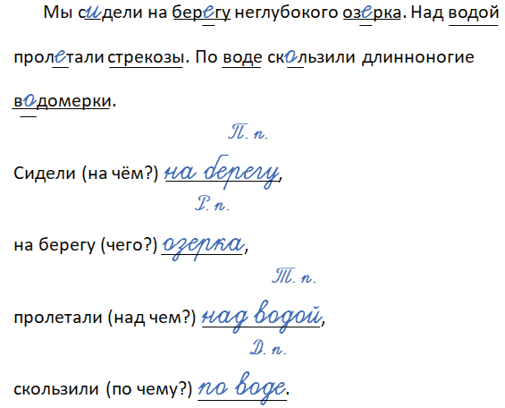 Мы с_дели на бер_гу неглубокого оз_рка. Над водой прол_тали стрекозы. По воде ск_льзили длинноногие в_домерки.