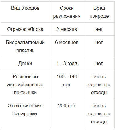 Безвредными отходами являются огрызок яблока, биоразлагаемый пластик, доски. К очень ядовитым отходам относятся резиновые автомобильные покрышки и электрические батарейки. Быстрее всего разлагается огрызок яблока, медленнее всего - электрические батарейки.