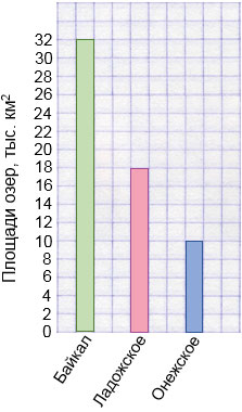 а) Постройте столбчатую диаграмму площадей озер Байкал (32 тыс. км2), Ладожское (18 тыс. км2), Онежское (10 тыс. км2), если 2 тыс. км2 соответствует 1 клетка тетради.