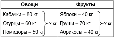 С фермы отгрузили в магазин 80 кг кабачков, 60 кг огурцов, 40 кг яблок, 50 кг помидоров, 70 кг груш, 40 кг абрикосов. Сколько килограммов овощей и сколько килограммов фруктов отгрузили в магазин?