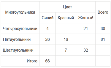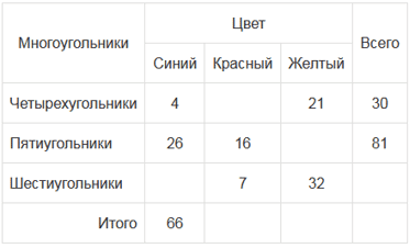 1) 30 - (21 + 4) = 30 - 25 = 5 (мн.) - желтые четырехугольники.