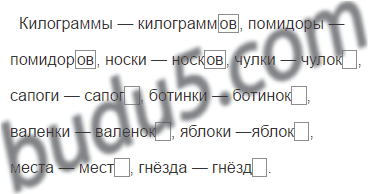 Килограммы — килограммов, помидоры — помидоров, носки — носков, чулки — чулок, сапоги — сапог, ботинки — ботинок, валенки — валенок, яблоки —яблок, места — мест, гнёзда — гнёзд.