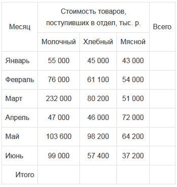 а) Чтобы найти общую стоимость товаров, поступивших в отделы магазина за каждый месяц, нужно сложить числа данные в таблице по строкам.