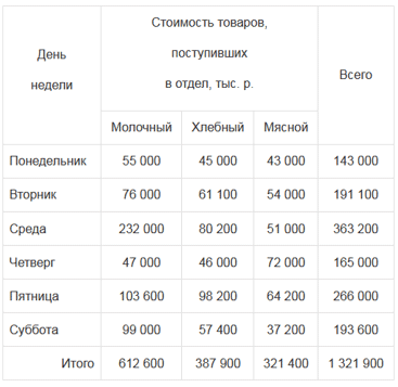 + 103 600 + 99 000 = 612 600 тыс. р. - стоимость товаров, поступивших в молочный отдел за неделю.
