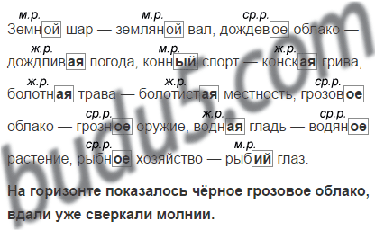 Сравниваем однокоренные прилагательные. У однокоренных прилагательных во всех парах совпадают корни, а суффиксы и окончания отличаются. Отличия есть и в значениях однокоренных прилагательных: земной шар (планета Земля) - земляной вал (земля, насыпанная горой); дождевое облако (облако, из которого пойдёт дождь) - дождливая погода (погода с дождём); конный спорт (спорт, в котором участвуют лошади) - конская грива (грива лошади); болотная трава (трава, растущая на болоте) - болотистая местность (местность, покрытая болотами); грозовое облако (облако, несущее грозу) - грозное оружие (представляющее угрозу); водная гладь (поверхность воды) - водяное растение (растущее в воде); рыбное хозяйство (хозяйство, выращивающее рыбу) - рыбий глаз (принадлежащий рыбе).