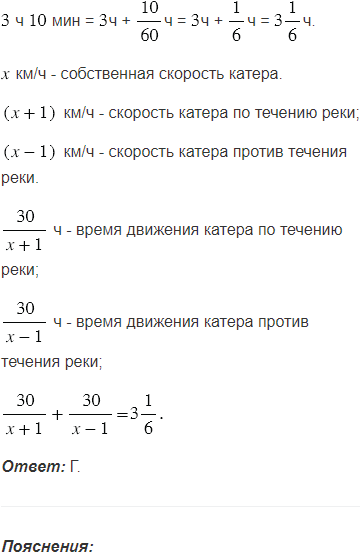 Катер прошел 30 км по течению реки и вернулся обратно, затратив на весь путь 3 ч 10 мин. Скорость течения реки равна 1 км/ч. Пусть собственная скорость катера составляет