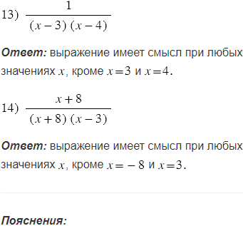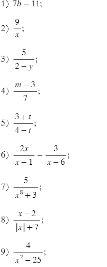 Дробные выражения - это алгебраические выражения, которые содержат деление на выражение с переменными. Отдельным видом рационального выражения является рациональная дробь. Это дробь, числитель и знаменатель которой - многочлены. Многочлен - это выражение, которое представляет собой сумму одночленов (числа и одночлены считают отдельными видами многочленов). Рациональная дробь может быть как целым выражением так и дробным. Знаменатель рациональной дроби не может быть нулевым многочленом, то есть многочленом, тождественно равным нулю. Допустимыми значениями переменных, входящих в рациональную дробь (дробное выражение), являются все те значения переменных, при которых значение знаменателя дроби не равно нулю.