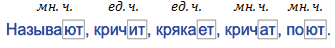 Глаголы: называют, кричит, крякает, кричат, поют. Чтобы определить число глагола, необходимо установить действие одного или нескольких предметов он обозначает, а также посмотреть на число существительного, с которым глагол связан.