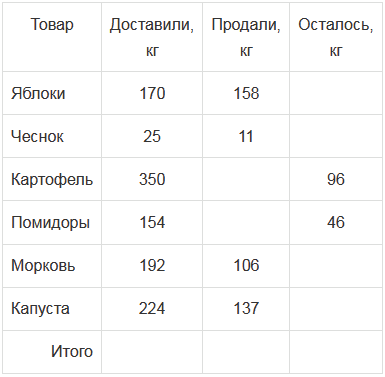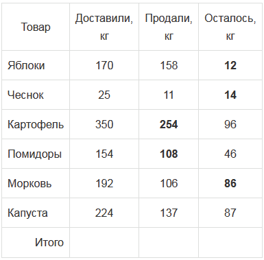 В таблице представлена информация о продажах по некоторым позициям на плодоовощной базе.