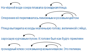На ч..рной воде оз..ра плавала громадная птица.4 Оп..рение её п..р..ливалось лимонным2 и розовым3 цветом. Птица выт..щила из воды мал..н..кую гол..ву, величиной с яйцо, з..росшую курча́вым пухом. К г..л..ве был как будто приклеен громадный клюв с кожаным красным мешком. Это пеликан.