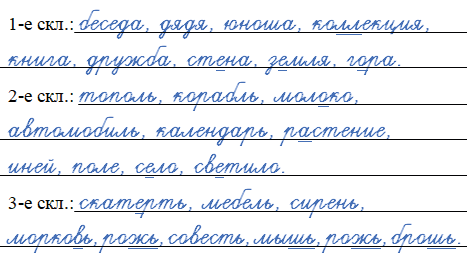 Прочитайте. Распределите имена существительные в три группы по склонениям. Запишите слова группами.