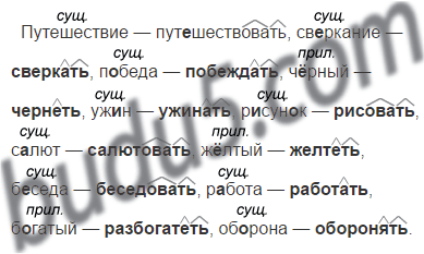 Сверкание - сверкать, победа - побеждать, чёрный - чернеть, ужин - ужинать, рисунок - рисовать, салют - салютовать, жёлтый - желтеть, беседа - беседовать, работа - работать, богатый - богатеть, оборона - оборонять.
