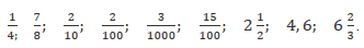 Одна четвертая апельсина , семь восьмых территории, две десятых доли секунды, две сотых огорода, три тысячных километра, пятнадцать сотых килограмма, две целых одна вторая процента, четыре целых шесть десятых гектара, шесть целых две третьих центнера.