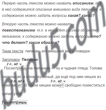 Первый абзац текста представляет собой описание, поскольку в нём описывается внешний вид пеликана. Второй абзац текста - повествование, поскольку в ней рассказывается о том чем и как питаются пеликаны.
