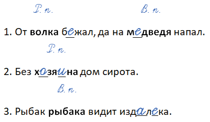 1. От волка (Р. п.) бежал, да на медведя (В. п.) напал.