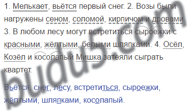 1. Мелькает, вьётся первый снег. 2. Возы были нагружены сеном, соломой, кирпичом и дровами. 3. В любом лесу могут встретиться сыроежки с красными, жёлтыми, белыми шляпками. 4. Осёл, Козёл и косолапый Мишка затеяли сыграть квартет.