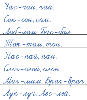 Краб, час, сок, лоб, бас, ток, пас, слог, миг, враг, лук, лес.