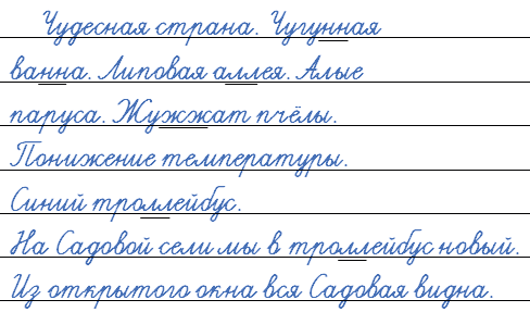 Чудесная стран..а. Чугунная ван..а. Липовая ал..ея. Ал..ые паруса. Жуж..ат пчёлы. Пониж..ение температуры. Синий трол..ейбус.