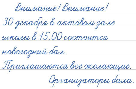 Попробуйте сами написать объявление. Подумайте, кому оно адресовано. О чём вы хотите в нём рассказать. Не забудьте подписать объявление.