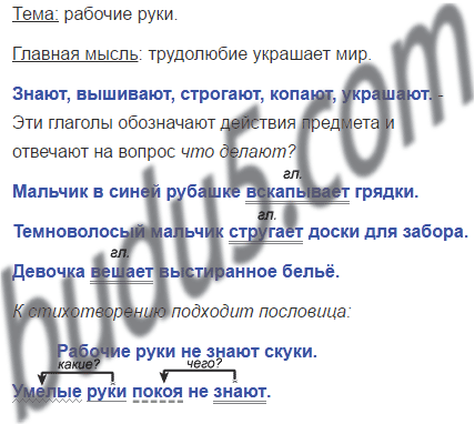 Глаголы: не знают, вышивают, строгают, копают, не знают, украшают. Все глаголы обозначают действия и отвечают на вопрос что делают?