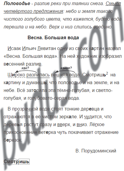 Исаак Ильич Левитан одну из своих к..ртин назвал «Весна. Большая вода». На ней художник изобразил в..сенний разлив. Ш..роко разл..лась вешняя вода.4 Смотриш..2 на к..ртину и думаеш.., что половодье и на земле, и на небе. Всё зат..пила эта тёмно-голубая, и светло-голубая, и голубовато-серая вода. В прозрачной воде стоят тонкие дер..вца и отражаются в её чистом зерк..ле. И чудится, что дерев..я растут сразу и вверх, и вниз. Лёгкое прикосновение вет..рка чуть покачивает отражение б..рёзок.