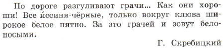 По дороге разгуливают грачи... Как они хороши! Все и́ссиня-чёрные, только вокруг клюва широкое белое пятно. За это грачей и зовут белоносыми.
