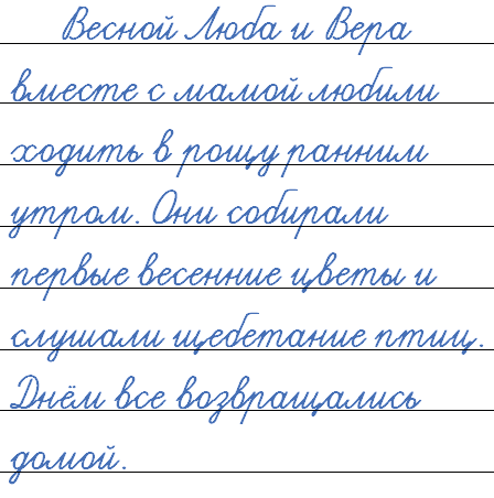 В..сной Люба и Вера вместе с мамой любили х..дить в рощ.. ранним утром. Они собирали первые весенние цв..ты и слушали щ..бетание птиц. Днём все возвращ..лись д..мой.