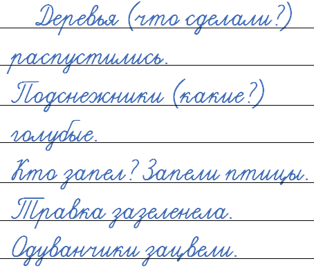 Определим части речи вставленных слов. Деревья (что сделали?) распустились (глагол). Подснежники (какие?) голубые (имя прилагательное). Кто запел? Запели птицы (имя существительное). Травка зазеленела (глагол). Одуванчики зацвели (глагол).