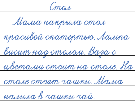 Мама накрыла стол красивой скатертью. Лампа висит у стола. Ваза с цветами стоит под столом. За столом стоят чашки. Мама налила на чашки чай.