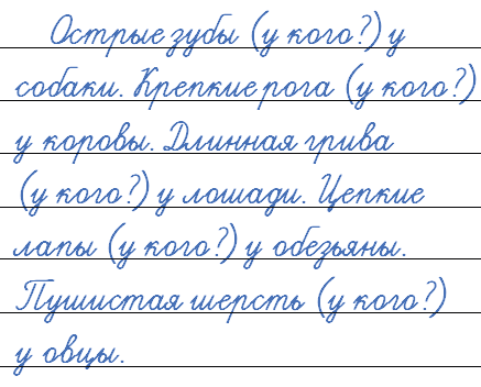 Острые зубы (у кого?) у ... . Крепкие рога (у кого?) у ... . Длинная грива (у кого?) у ... . Цепкие лапы (у кого?) у ... . Пушистая шерсть (у кого?) у ... .