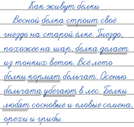 Весной белка строит своё гнездо на старой ёлке. Гнездо, похожее на шар, белка делает из тонких веток. Всё лето белки кормят бельчат. Осенью бельчата убегают в лес. Белки любят сосновые и еловые семена, орехи и грибы.
