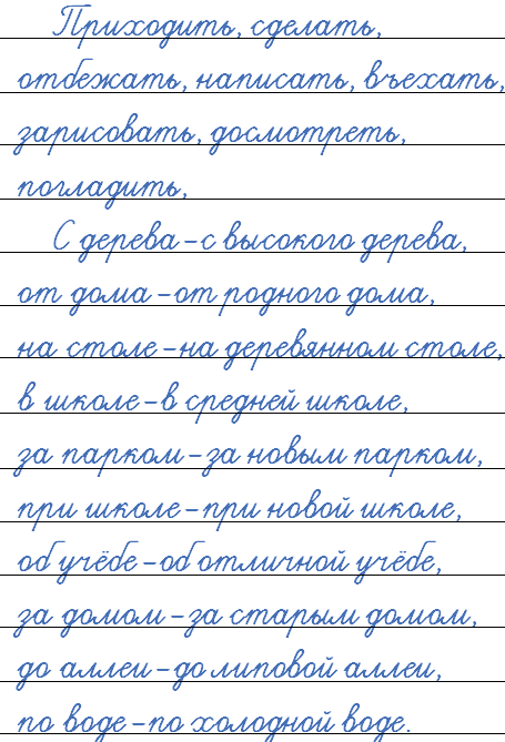 Приходить, сделать, с дерева, отбежать, от дома, написать, въехать, на столе, в школе, за парком, при школе, зарисовать, об учёбе, досмотреть, за домом, до аллеи, погладить, по воде.