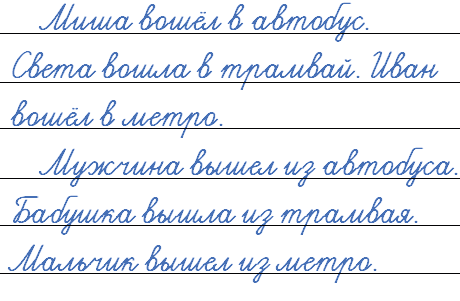 Составьте словосочетания вошёл в ..., вышел из ... (автобус, трамвай, метро). Придумайте и запишите предложения с этими словосочетаниями.