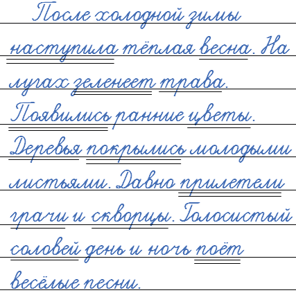 После х..лодной з..мы наступила тёплая в..сна. На лугах з..ленеет тр..ва. По..вились ранние цв..ты. Д..ревья покрылись м..лодыми л..стьями. Д..вно прил..тели гр..чи и скв..рцы. Г..лосистый с..л..вей день и ночь п..ёт в..сёлые песни.