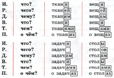 1. Сравните окончания существительных в каждом падеже. В чём сходство и различие?