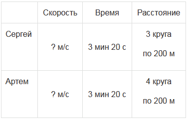 За 3 мин 20 с Сергей пробежал по беговой дорожке вокруг поля школьного стадиона 3 круга, а Артем - 4 круга. На сколько метров в секунду скорость Артема больше скорости Сергея, если длина дорожки 200 м?