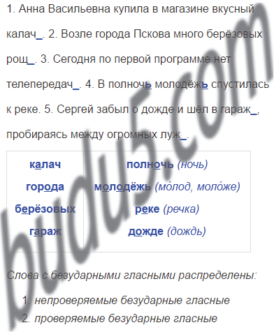 1. Анна Васильевна купила в магазине вкусный калач_. 2. Возле города Пскова много берёзовых рощ_. 3. Сегодня по первой программе нет телепередач_. 4. В полноч_ молодёж_ спустилась к реке. 5. Сергей забыл о дожде и шёл в гара_, пробираясь между огромных луж_.