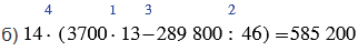 б) 14 • (3700 • 13 - 289 800 : 46).