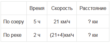 Моторная лодка шла 2 ч по реке и 5 ч по озеру. Найдите, сколько всего километров прошла моторная лодка, если по озеру она двигалась со скоростью 21 км/ч, а по реке - на 4 км/ч быстрее.