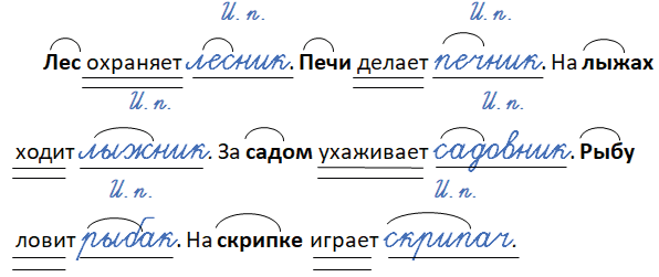 Лес охраняет лесник (И. п.). Печи делает печник (И. п.). На лыжах ходит лыжник (И. п.). За садом ухаживает садовник (И. п.). Рыбу ловит рыбак (И. п.). На скрипке играет скрипач (И. п.).