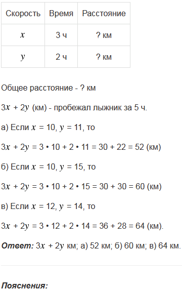 Лыжник бежал 3 ч со скоростью км/ч и 2 ч со скоростью км/ч. Сколько всего километров пробежал лыжник за эти 5 ч? Для решения задачи составьте выражение и найдите его значение при: