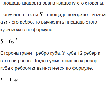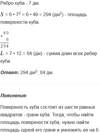 Вычислите площадь поверхности и сумму длин всех ребер куба, если его ребро равно 7 дм.