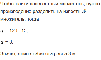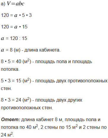 а) Объем кабинета математики равен 120 м3, высота 3 м, ширина - 5 м. Вычислите длину кабинета и площади пола, потолка и каждой стены.