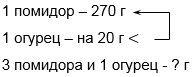 Чему равна масса трех помидоров и одного огурца, если масса помидора 270 г, а масса огурца на 20 г меньше?