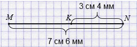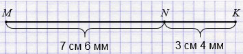 МK = MN - NK = 7 см 6 мм - 3 см 4 мм = 4 см 2 мм