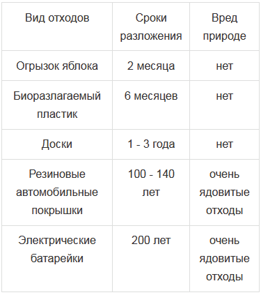Безвредными отходами являются огрызок яблока, биоразлагаемый пластик, доски. К очень ядовитым отходам относятся резиновые автомобильные покрышки и электрические батарейки. Быстрее всего разлагается огрызок яблока, медленнее всего - электрические батарейки.
