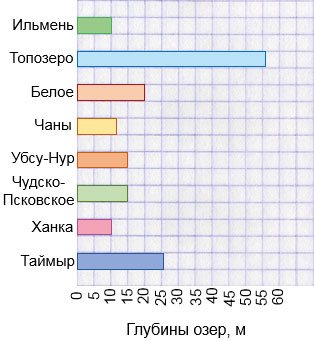 Столбчатая диаграмма глубины озер Байкал, Ладожское, Онежское.