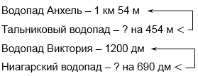 Самый высокий водопад в мире - Анхель (Южная Америка), его высота 1 км 54 м. Высота Тальникового водопада (Россия) на 454 м меньше высоты Анхеля. Высота водопада Виктория (Африка) - 1200 дм, а Ниагарский водопад (Северная Америка) на 690 дм ниже его. Найдите высоту каждого водопада. Запишите названия водопадов в порядке возрастания их высоты.